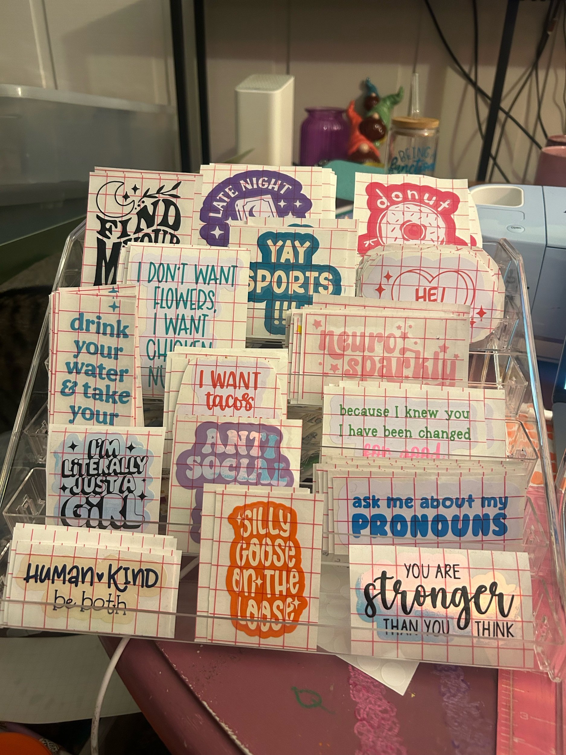 bring home some whimsy bring home some whimsy Clear All | Stickers | Blankets | Tote Bags | Filters Categories All Stickers Blankets Tote Bags Filter Clear Filter For Good | Patchwork Blanket $150.00 Add To Cart Added! Stickers from $2.00 Select Size Small Medium Large Add To Cart Added! Zippered Pouch from $5.00 Select Size Small Medium Large Add To Cart Added! Hair Scrunchie from $4.00 Select 3 pack 1 3 Add To Cart Added! Away We Go | Patchwork Blanket $150.00 Add To Cart Added! Hot Dog | Tote Bag $30.00 Add To Cart Added! Hot Sauce | Tote Bag $30.00 Add To Cart Added! Galaxy Far Far Away | Star Wars Tote Bag $30.00 Add To Cart Added! Grandma's Attic | Tote Bag $30.00 Sold out Sold Out Added! Getaway Car | Vinyl Sticker $3.00 Blue Pink Add To Cart Added! Support Your Local Library | Vinyl Sticker $4.00 Add To Cart Added! You Can Do Hard Things | Vinyl Sticker $4.00 Add To Cart Added! Be Kind Dinosaur | Vinyl Sticker $4.00 Add To Cart Added! 988 | Mental Health Sticker $5.00 Add To Cart Added! Read Books, Be Kind, Stay Weird | Vinyl Sticker $4.00 Add To Cart Added! True Crime Podcasts | Vinyl Sticker $4.00 Yellow White Green Pink Red Add To Cart Added! Don't Honk at Me | Goose Sticker $4.00 Add To Cart Added! Adult-ish | Vinyl Sticker $3.00 Add To Cart Added! Pronoun stickers - he/him, she/her, they/they - ask me about my pronouns from $2.00 Select Primary color she/her he/him they/them Ask Me! All Four Stickers Add To Cart Added! Just Breathe | Mental Health Butterfly Sticker $3.00 Add To Cart Added! Neuro-sparkly | neurodivergent awareness sticker $2.00 Pink Green Yellow Add To Cart Added! Take Your Meds | Vinyl Sticker $2.00 Pink Blue Add To Cart Added! Rainbow Squares | Patchwork Blanket $200.00 Add To Cart Added! Barbie Girl | Tote Bag $30.00 All Pink Pink + white handles White + Pink Add To Cart Added! Fiesta with The Force | Star Wars Tote Bag $30.00 Add To Cart Added! Pigeons Party | Tote Bag $30.00 Add To Cart Added! Rainbow Stripes | Tote Bag $30.00 Colorful Floral Hot Dog Print Add To Cart Added! Motivational Cheeses | Tote Bag $30.00 Add To Cart Added! When Pigs Fly | Tote Bag $30.00 Add To Cart Added! Man of Steel | Superman Tote Bag $30.00 Add To Cart Added! Grazing Dinosaurs | Tote Bag $30.00 Blue lining Green lining Add To Cart Added! Enchanting Flowers | Tote Bag $30.00 Add To Cart Added! Lost in the Jungle | Tote Bag $30.00 Add To Cart Added! Ocean of Flowers | Tote Bag $30.00 Add To Cart Added! Neon Leopard | Tote Bag $30.00 Add To Cart Added! Grand Bouquet | Tote Bag $30.00 Add To Cart Added! Water Fight | Tote Bag $30.00 Under the Sea lining Hot Dog lining Add To Cart Added! Rocko's Modern Life | Tote Bag $30.00 Grey Floral lining Pink Swirls lining Add To Cart Added! Orange You Glad | Tote Bag $30.00 Add To Cart Added! Gimme Space | Tote Bag $30.00 Add To Cart Added! Pawnee Employee | Parks N Rec Tote Bag $30.00 Add To Cart Added! It's Rolling Cats and Dogs | Tote Bag $30.00 Add To Cart Added! Pretty Girls Read Dirty Books | Vinyl Sticker $3.00 Add To Cart Added! Scrappy Happy | Patchwork Blanket $150.00 Add To Cart Added! No results found No results match your search. Try removing a few filters.